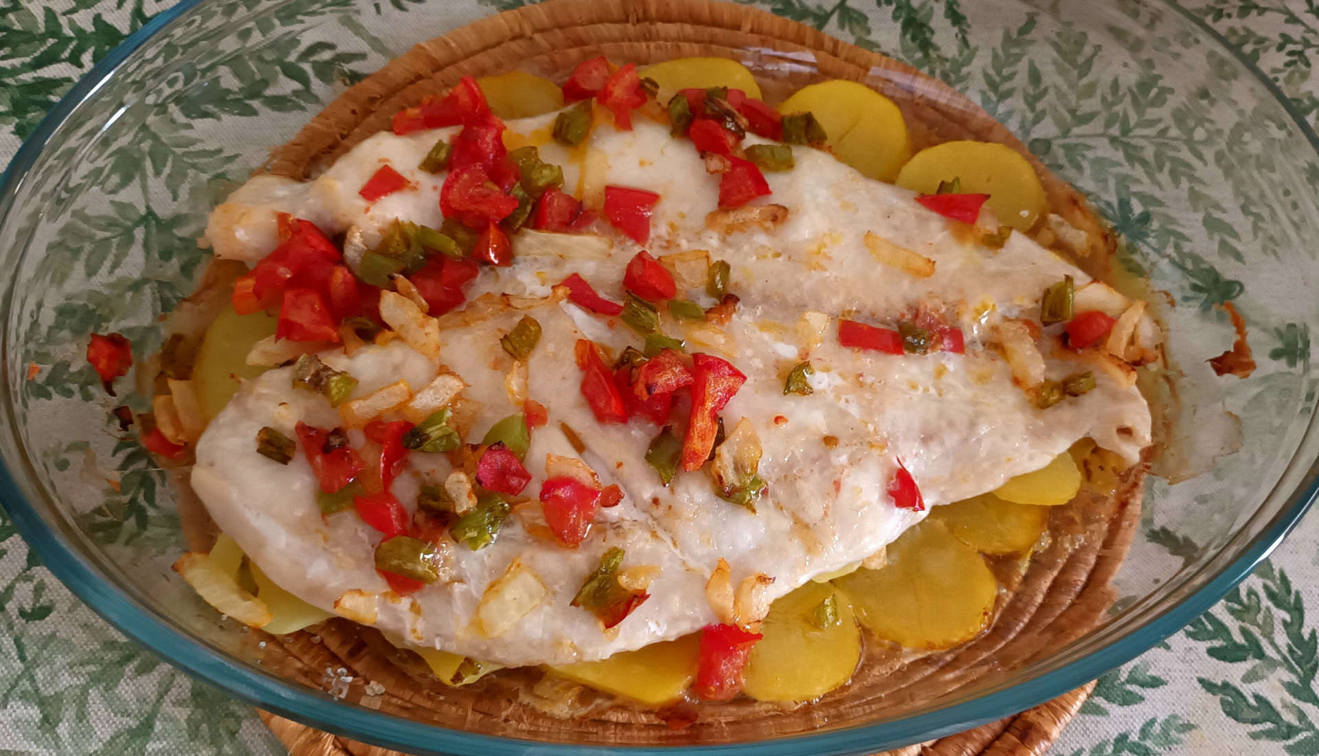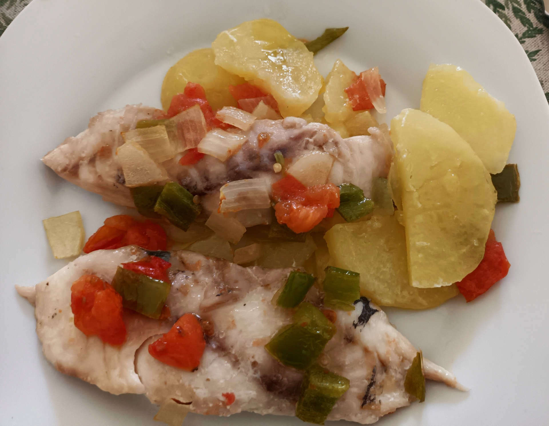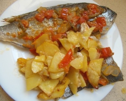 Otra forma de hacerlo es con patatas, tomate, pimiento y cebolla. Pelamos y cortamos las patatas en rodajas finas. Cortamos en trocitos la cebolla, el pimiento y el tomate. Colocamos las patatas en el fondo de una fuente de horno con un poco de sal, encima ponemos el pescado y lo salamos también. Echamos por encima las verduras picadas y la metemos al horno, precalentado como en la opción anterior.