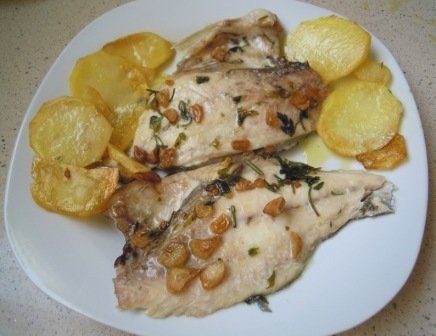 Salamos el pescado y echamos por encima el refrito de ajo y perejil, lo metemos al horno precalentado a 180º y esperamos que se haga. Cuando veamos la carne blanca estará en su punto.