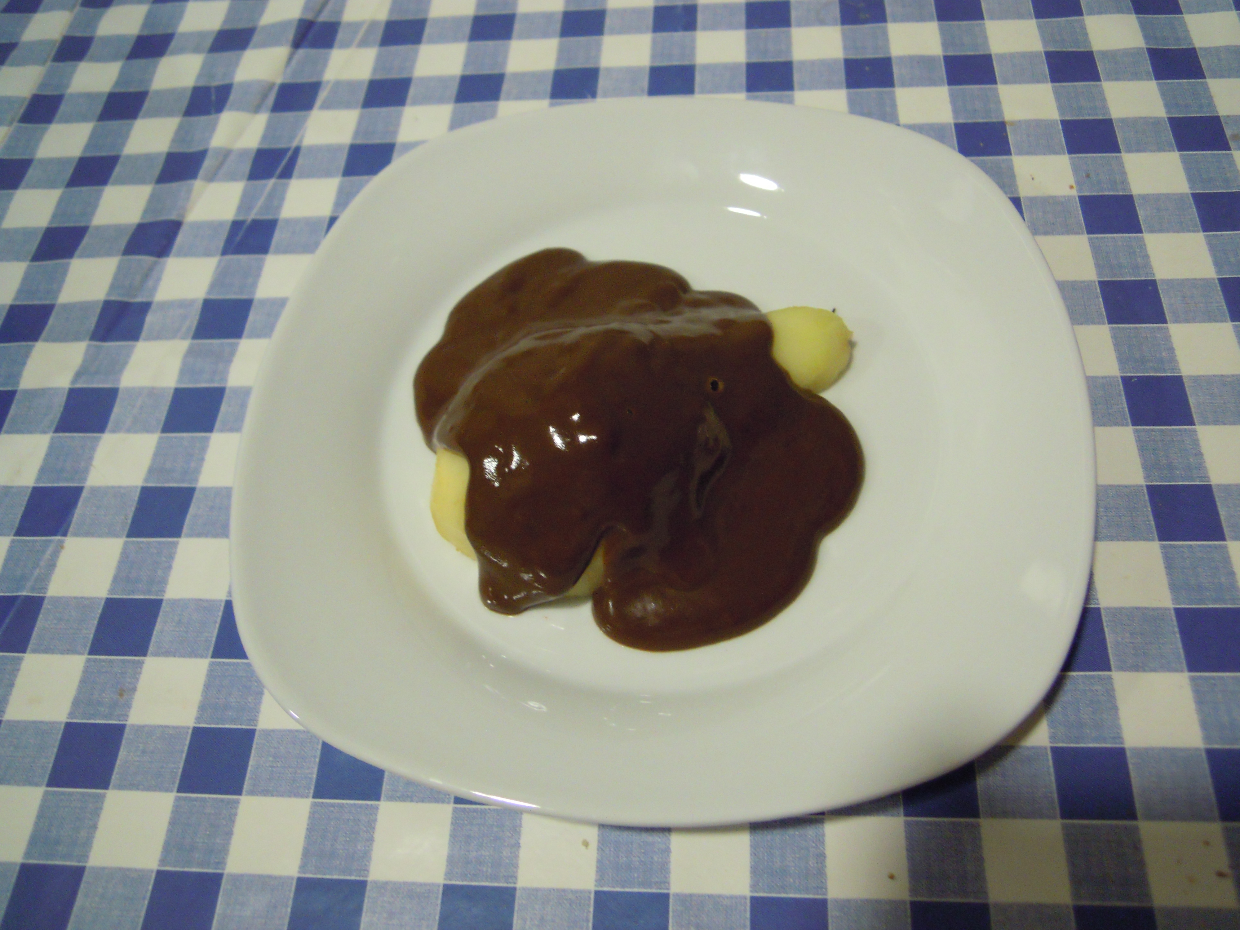 En un cazo se derrite la tableta de chocolate, cortandola a trocitos y con un poquitín de agua. Se echa por encima a las frutas y ya está.