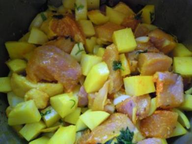Se echa todo en la olla rápida y se mezcla con una cuchara de madera. Se cubre con agua y se deja a fuego fuerte unos 20 minutos.