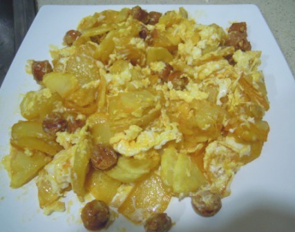 Pelamos y cortamos las patatas en rodajas. Las freimos en aceite no muy fuerte para que se queden blanditas, no muy fritas. En una sartén echamos un poco de aceite, y rehogamos la chistorra cortada en rodajitas. Si no tenemos chistorra usamos chorizo. Añadimos las patatas. Rompemos los huevos encima y los revolvemos con un tenedor de madera, que irá pinchando las yemas y mezclando las claras. Echamos un poco de sal, a gusto, movemos un poco más y ya está.