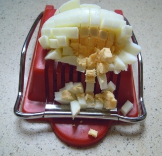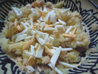 Se echa un poco de sal y vinagre, y la lata de atún con el aceite. Se mezcla. Se añaden las gambas peladas y se mezclan también. Se corta el huevo duro en cuadraditos o tiritas.