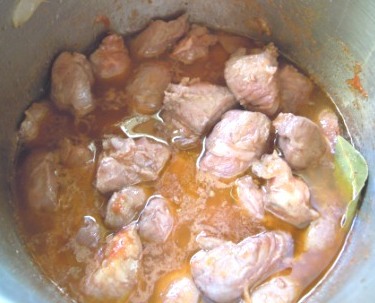 La carne se deja un rato con sal y pimienta negra. Se echa aceite en el fondo de la olla y se pasa la carne vuelta y vuelta. Se saca y reserva.