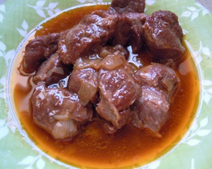 En la olla se echa media cebolla picada y dos dientes de ajos picados. Se refríe un poco, y se añade la salsa de tomate, un vaso de vino tinto, una hoja de laurel y una zanahoria picada. Se deja hacer 5 minutos para que el alcohol se evapore. Se añade la carne, se cubre con agua y se echa una pastilla de caldo. En la olla rápida unos 15 minutos.