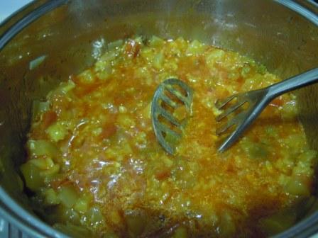 Cuando estén tiernas las verduras se añade un poco de tomate frito, sobre todo para darle color.Yo lo aplastoo todo con un «estrujapatatas», para que quede sin tantos trozos, más triturado.