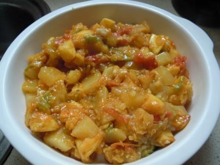 Esta es una variante del pisto al que he añadido cuadraditos de patatas fritas.