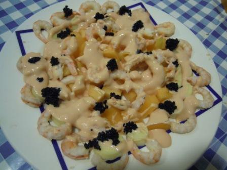 En una bandeja se hace una cama de lechuga, encima se pone el melón y los palmitos. Sobre esto se colocan los langostinos. Se echa por encima salsa rosa y se decora con huevas de lumpo.