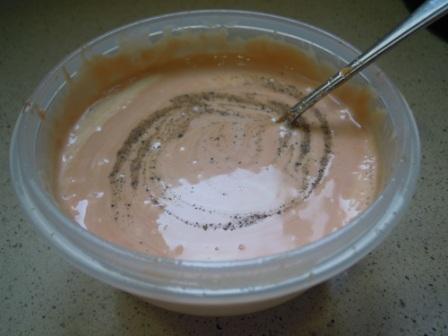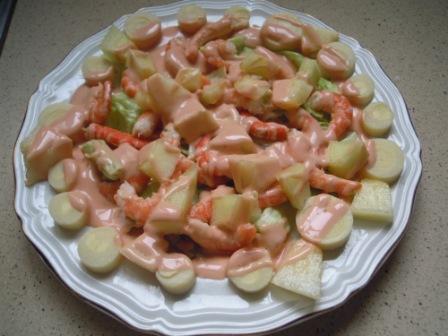 Se hace una salsa rosa con mayonesa, ketchup, un poquitin de coñac y de pimienta molida.