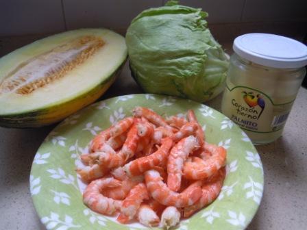 Se corta la lechuga, el melón y los palmitos. Se pelan los langostinos.