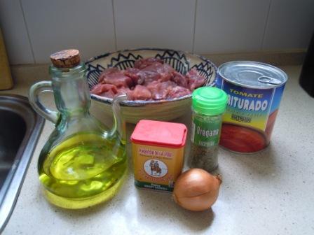 En una olla rápida (para que tarde menos tiempo) se echa un poco de aceite de oliva, como medio dedo de altura, y se refríe la cebolla picada. Cuando esté dorada se echa la carne y se rehoga, luego sal y un vaso bien lleno de vino, fino u otro parecido. Cuando hierva se añade agua que la cubra, el pimentón, la pimienta, el orégano y el tomate frito.