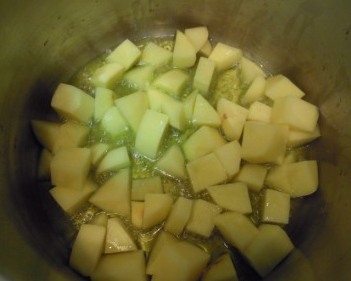 En la olla rápida se echa aceite en el fondo y se refríen un poquitín las patatas.