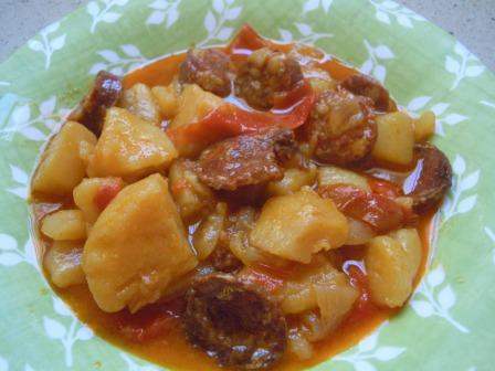 Lo pongo entre comillas porque están hechas a mi manera, y puede que alguien sepa cómo se hacen ortodoxamente a la riojana y me comente que no es así. Es un guiso de patatas con chorizo inspirado en la receta riojana. Quedan realmente buenas.