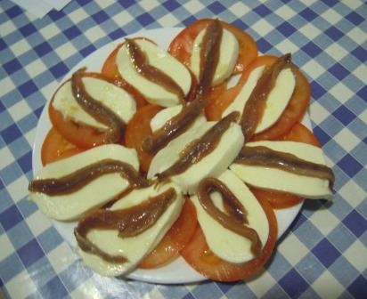 Lo mismo se hace con el tomate. Se sacan las anchoas. En una fuente o plato se colocan las rodajas de tomate, encima las de Mozarella, y por último, las anchoas con su aceite.