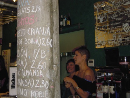 Pero no es esta la primera experiencia gastronómica de sus dueños, siempre ayudados magnificamente por sus familiares tanto en el montaje como en la elaboración de los platos, porque ya con anterioridad han demostrado su valía en otros bares y restaurantes gaditanos y de otras ciudades.En una columna, y escritos con tiza, se pueden leer los vinos que ofrecen y el precio de la copa. En la foto, tras la columna, Mari Carmen Adán.