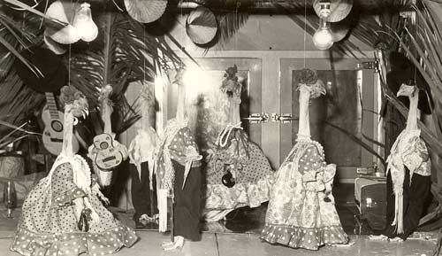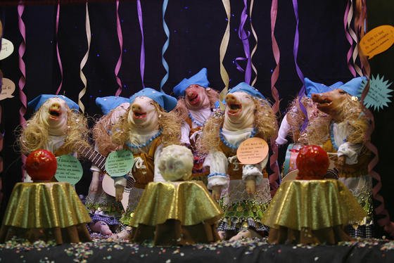 Los puestos de carne exponían cerdos disfrazados, recuerdo un puesto de I. Aguilar con cerdos vestidos de flamencos representando un tablao. Los puestos de recova disfrazaban a los pollos y los pavos. Muchas veces la representación o escena era una crítica a los políticos, al Ayuntamiento, o ridiculizaban a personajes famosos.