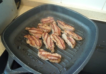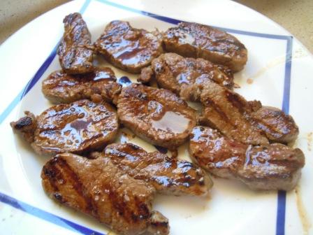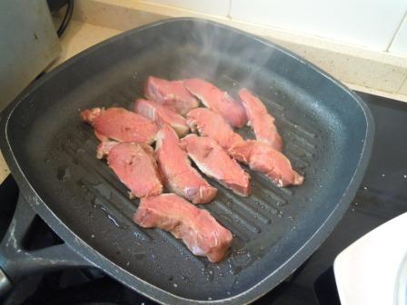 En una sartén-plancha se echa un poco de aceite y, una vez caliente, se van haciendo los filetitos de lomo, que habremos cortado previamente.