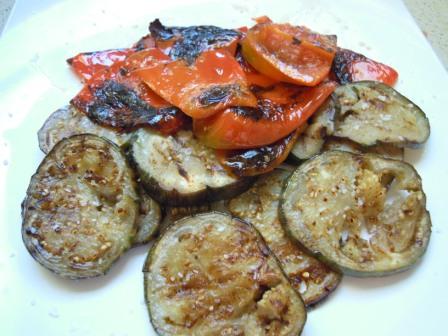 En la misma sartén se ponen rodajas o trozos de verduras, berenjenas, pimientos rojos, cebolla, calabacines, tomates…Lo que tengamos. Se dejan hacer y se salan una vez hechos.