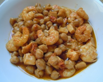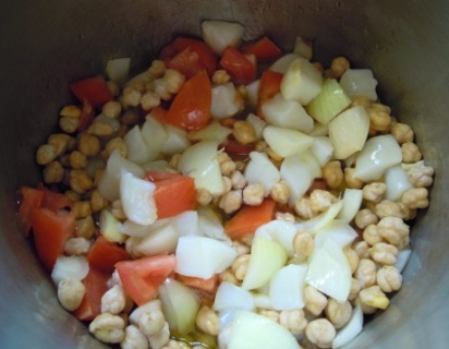 En la olla se pone un fondo de aceite, el tomate y la cebolla picados, los garbanzos y los chocos cortados a cuadritos. Se ponen a hervir con un poco de agua, unos 10 minutos en la olla rápida.