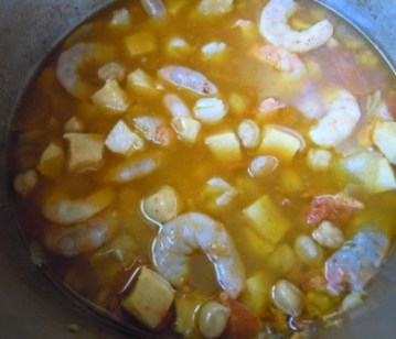 Se añade a la olla junto con los langostinos, ya pelados, añadir un poco de agua y dejarlo hacer otros diez minutos. La salsa debe quedar espesita.