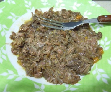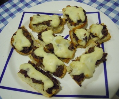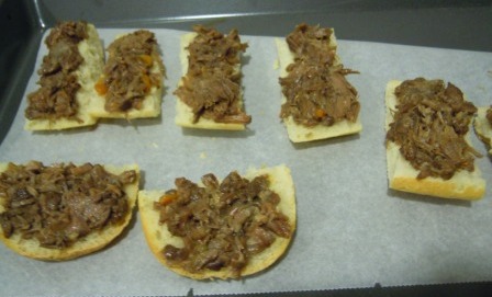 Se cortan rodajitas de pan. Se tritura la carrillada con un tenedor, procurando que no tenga mucha salsa, escurrida.