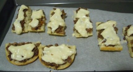 Se coloca un poco de carrillada en cada tostada, y encima un poco de bechamel.