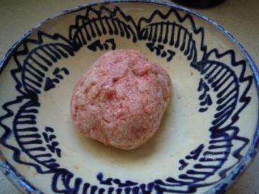 Se echa en un cuenco la carne picada y se mezcla con los dientes de ajo muy picaditos, los huevos un poco batidos, un poco de pan rallado, un poco de perejil y sal. Se hace una bola y se deja reposar unas horas para que la carne coja el sabor.