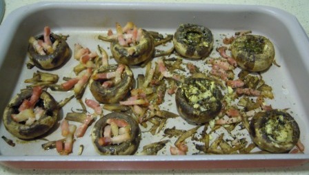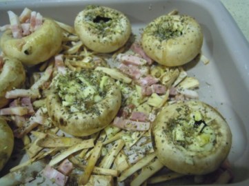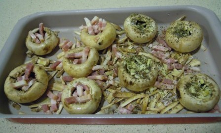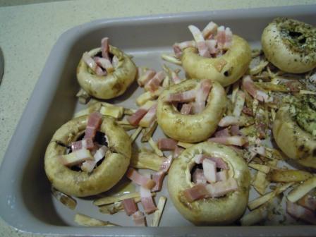 Se les corta el tronco a los champiñones y se pican en trocitos. En una bandeja de horno o besuguera se colocan los champiñones boca arriba, se rellenan con la mezcla de bacon, ajitos, trocitos de champiñones y perejil, todo cortado  en trocitos pequeños.