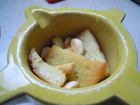 En una olla se pone aceite en el fondo, y en él se refríe el pan, las almendras y el ajo. Una vez frito se sacan y se machacan en un mortero.