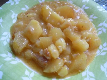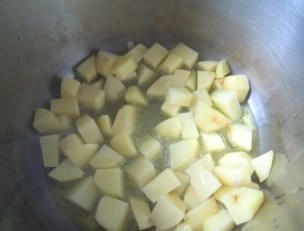 En el mismo aceite de la olla se refríen un poco las patatas cortadas en cuadrados y, cuando estén un poquito refritas se añade el majao y el resto del caldo, con el pimentón dulce.