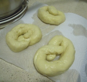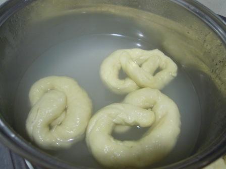 Cuando la mezcla este hirviendo, se retira del fuego y se sumergen los pretzel;  antes de llevarlos a la bandeja del horno, los dejo secar en papel de cocina. Como lo más probable es que no quepan todos de una vez en la olla, podéis repetir la operación tantas veces como sea necesario, llevando siempre la mezcla a ebullición antes de sumergir la nueva tanda.