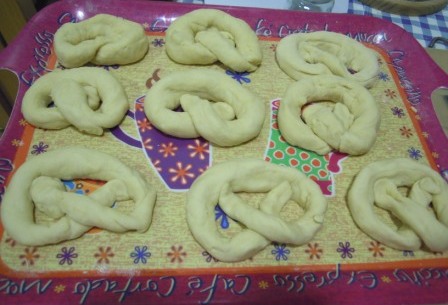 Se trocea en 6 u 8 porciones (dependiendo del tamaño que más os guste). Personalmente peso las porciones para obtener unidades de tamaño similar (entre 20 y 25 gr.). Para darle forma, se extiende cada una de las porciones en la superficie de trabajo algo enharinada para dar forma de rulo de unos 30 cms. de largo, dejando la parte central un poco mas gruesa que las puntas. Luego se da la forma característica de lazada del pretzel; esto se hace a base de práctica, podéis ver el juego de muñecas que destilan estos panaderos alemanes y practicar con ellos.