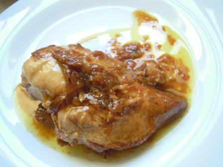 En el mismo fondo se doran las pechugas o el pollo, y se les echa sal y un buen vaso de vino oloroso. Se añade medio vaso de agua y se cierra la olla.