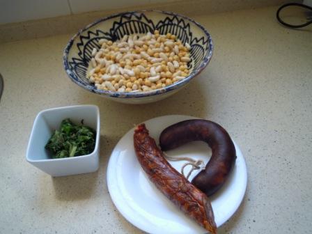 Se dejan en remojo los garbanzos y las judías toda una noche. Se escurren y se ponen en una olla rápida (es mejor que una olla normal que tarda mucho), se añade la verdura, la morcilla y el chorizo. Encima se echa la sal, una cucharadita de pimentón dulce, un poco de comino en grano y un chorrito de aceite. Se cubre de agua.