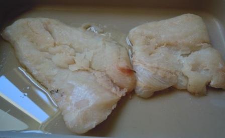 En una tartera o bandeja de horno se echa un poquito de aceite en el fondo y se colocan los trozos de merluza. Mejor fresca que congelada, está más sabrosa. Se sazonan a gusto.