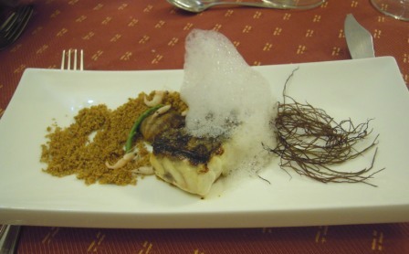 San fernando 136San fernando 137Y por último un lomo de corvina con textura de arena y aire de la bahía. La textura de arena está hecha con polvo de algas, pan rallado y mantequilla. Y el «aire» que simula una ola que choca contra una roca (el lomo de corvina), está hecho con el agua de la cocción de los camarones y las almejas