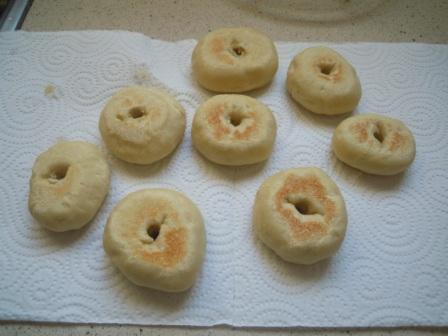 Retiramos la olla del fuego y sumergimos los bagels hasta que floten, les damos la vuelta. Repetir  la operación tantas veces como sea necesario según el número de bagels que tengamos, llevando previamente el agua a ebullición cada vez que vayamos a sumergir nuevos bagels.