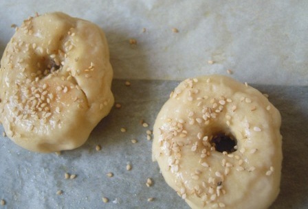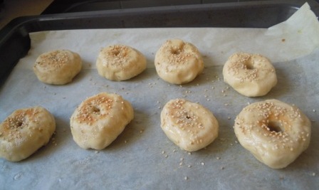 Precalentamos el horno a 200º y llevamos los bagels a una bandeja de horno. Pintamos con la clara de huevo batida y mezclada con una cucharada de agua o leche, espolvoreamos con semilla de sésamo  (opcional) y horneamos durante 25 minutos con el horno a 180º hasta que se doren.