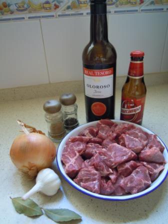 Una vez limpia la carne se corta en trozos no muy grandes. Se corta la cebolla y se pelan los dientes de ajo.