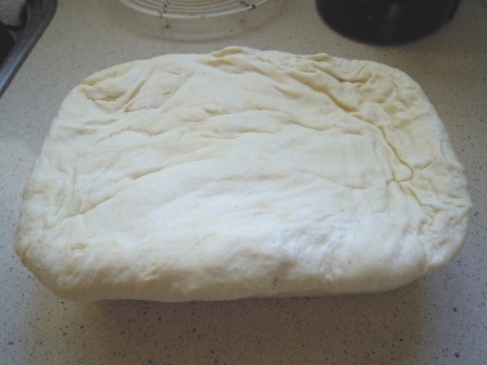Preparar una superficie de trabajo aceitada (yo suelo utilizar la encimera de mi cocina), y trabajar la masa, aplastándola bien con las manos durante 15 minutos.