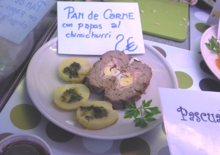 Probamos un pastel de carne con patatas acompañadas de salsa chimichurri, que estaba riquísima (la recomiendo), de Argendarte. Este puesto lo llevan adelante Jorge Maurano y Marcela.