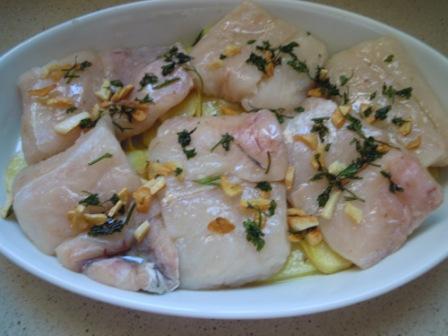 Se ponen en una bandeja de horno unas rodajas de patata pasadas un poco por aceite, sin llegar a freirlas del todo. Si las ponemos crudas tardan más en hacerse que el pescado, y éste sale más seco.