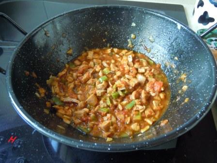 Se tiene unos minutos en el fuego y se añade la carne y las salchichas cortadas en trocitos. se mezcla bien.
