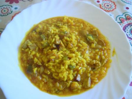 Me sobraron unos trocitos de solomillo, por supuesto no pensaba tirarlos, pero tampoco era cantidad suficiente para un plato solo de carne. Así que hice un arroz con esa carne y le añadí unos trocitos de salchichas.