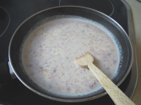 En una sartén u ollita se echa la leche, el queso y el foie gras, y se calienta removiendo con una cuchara de madera, hasta que se derrita el queso y el foie gras se disuelva.