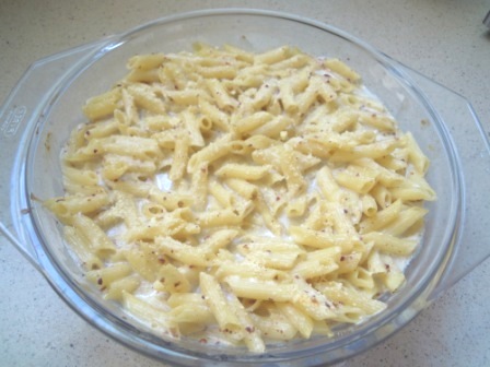 Esta mezcla se echa sobre los macarrones y por encima el queso rallado. Se mete al horno hasta que esté doradito por la parte de arriba.