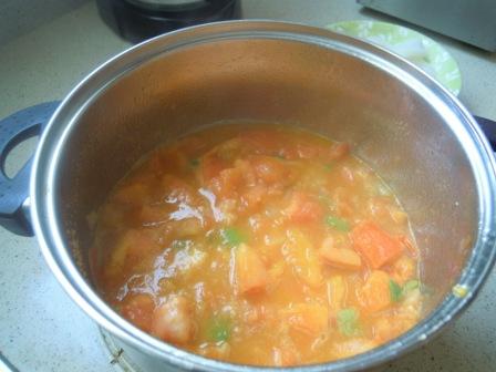 Se corta el tomate, la cebolla y el pimiento en trocitos. En una olla se echa aceite de oliva en el fondo, y se refríe la cebolla y el pimiento y, cuando esté un poco pasado, se añade el tomate. Conforme se van friendo se van aplastando con una cuchara de madera, sobre todo el tomate.
