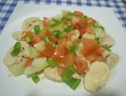 Aparte se corta el tomate, el pimiento y la cebolla en trocitos pequeños, se mezcla todo bien y se aliña con sal, vinagre y aceite, en este orden.