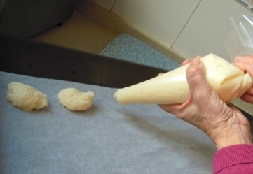 En una bandeja de horno con papel apto para el mismo se van colocando montoncitos. Se pueden hacer con una manga pastelera o una cuchara.