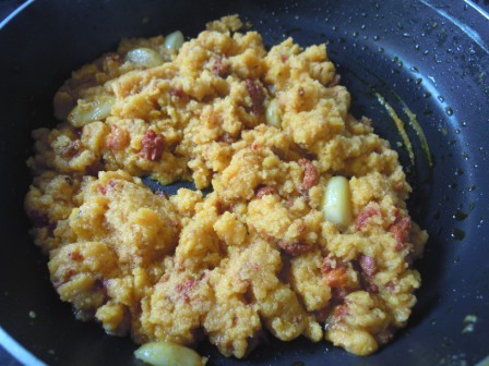 Cuando estén dorados añadir agua y sal. Al empezar a hervir añadir poco a poco la sémola, y no dejar de remover hasta que se formen las migas, unos 10 minutos.