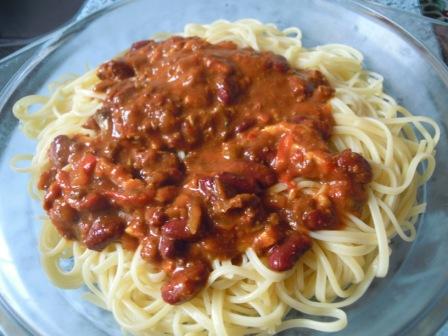 Para rellenar estas tortitas se hace una salsa de la que, generalmente, suele sobrar. Y no están los tiempos para tirar nada. Así que aquí propongo una manera de aprovecharla, añadirla a spaguetis u otro tipo de pasta, macarrones, fusilis…